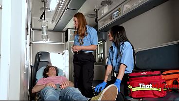 A brunette with large breasts restrained in chains vigorously performs climax on a fortunate couple